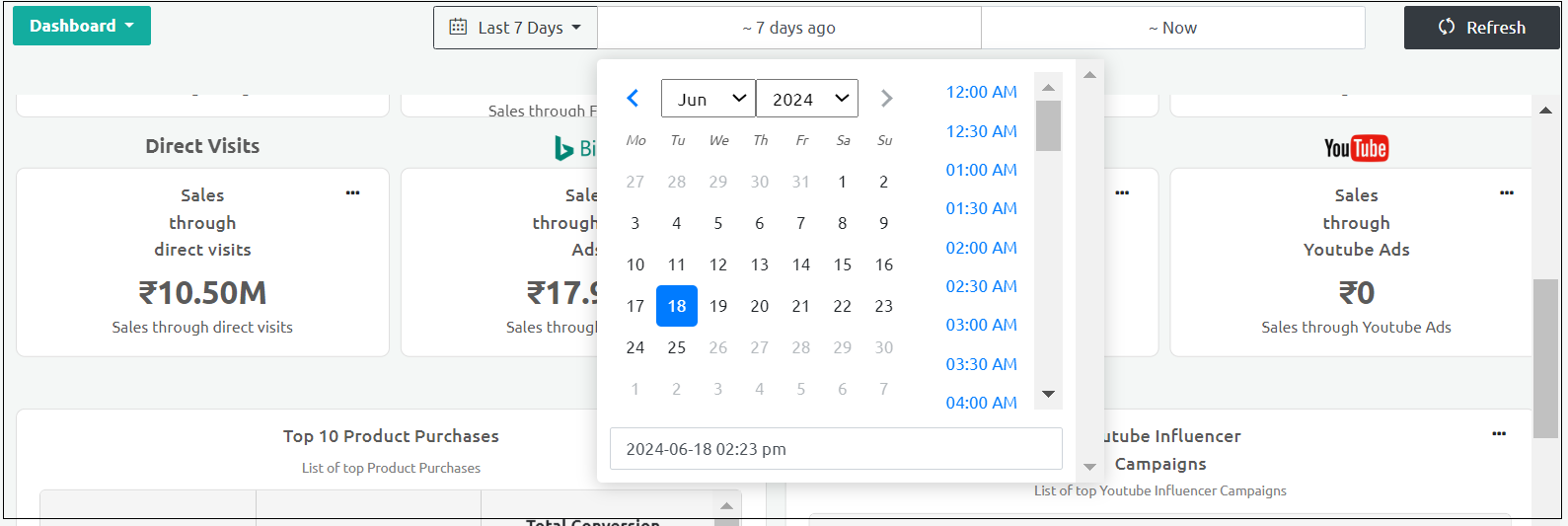 By default, the Dashboard is set to display the data for the last 7 days. To view the data for a different time duration, you must set the time range from the Last 7 days tab on the top of the page and click Refresh.