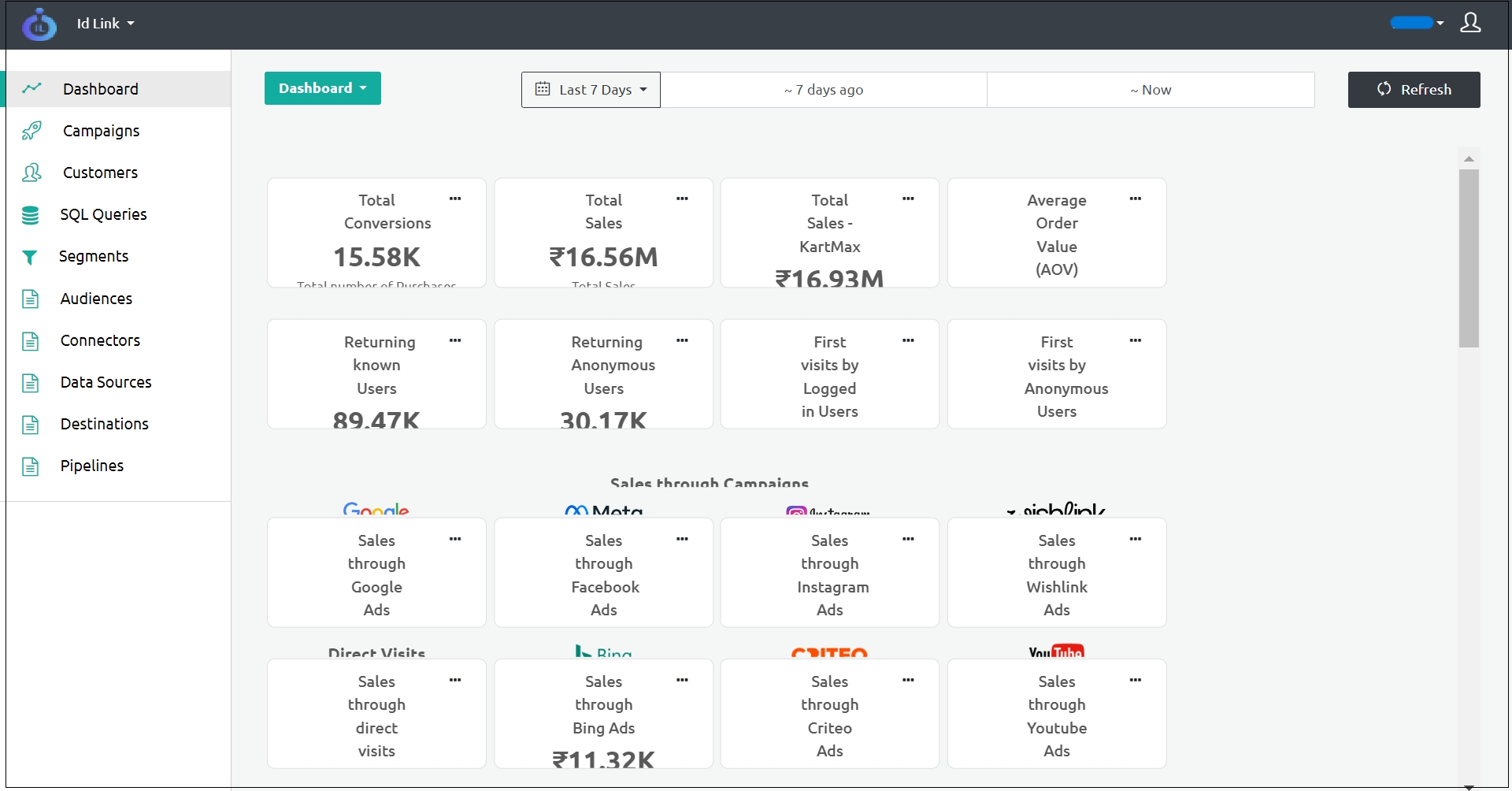 Total sales through various ad campaigns on Google, Meta, Instagram, Wishlink, Bing, Criteo, YouTube, and others.