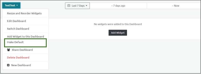 You can make a newly created dashboard the default dashboard. Select Make Default from the newly created dashboard drop-down menu.