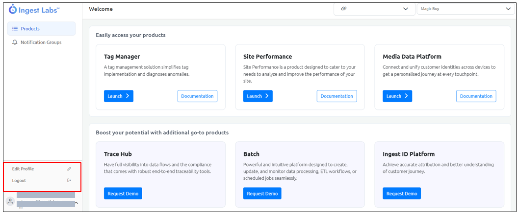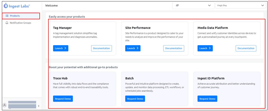 The **Products** section includes the list of products available for a particular Ingest Labs project.