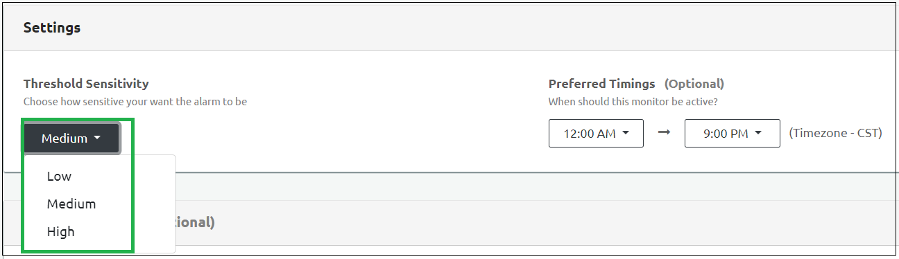 Select the exact tag monitoring period from the Preferred Timings drop-down. This is an optional setting. For example, If there is a sudden spike in traffic in the evenings, you could set the preferred timing from 5 p.m. to 10 p.m. The tag firing activities will be monitored every evening between 5 p.m. to 10 p.m.