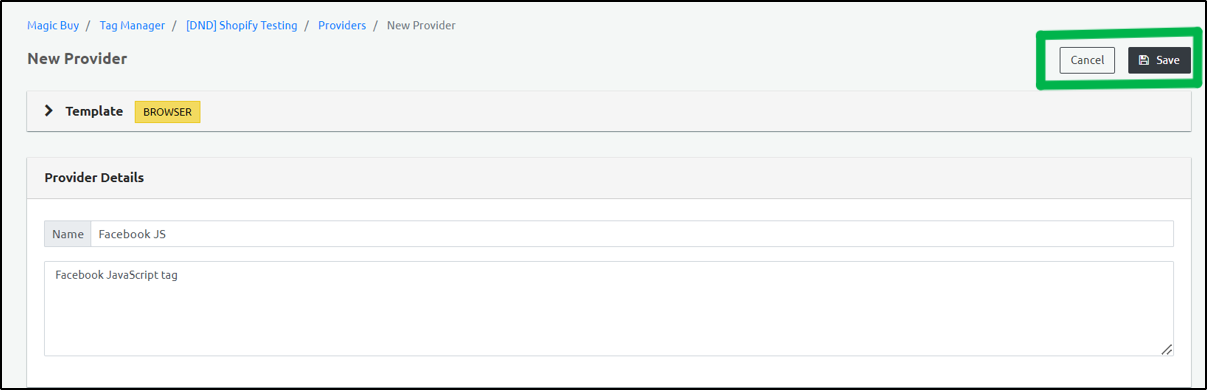 Step 8: Click Save on the top right to save the new Provider (Browser).