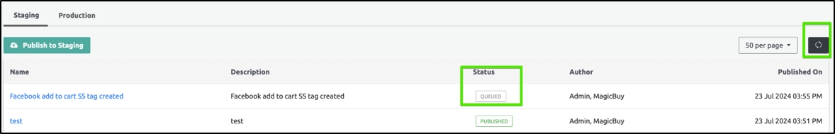 Step 7: Click the refresh icon on the top right to change the status from Publish to Staging->Queued->Finished->Published.