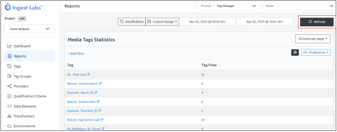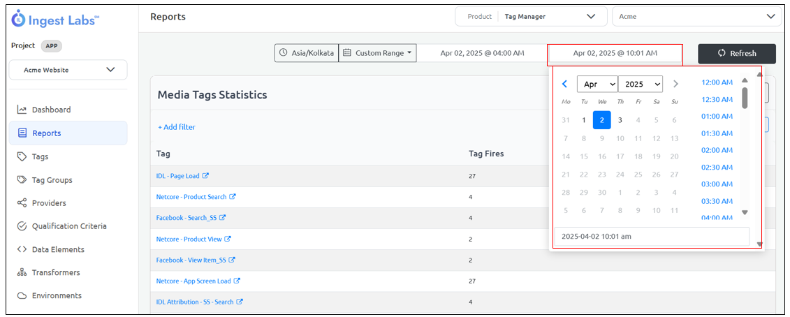 * Each time you modify the time range selection, click the **Refresh** button to update the report accordingly.