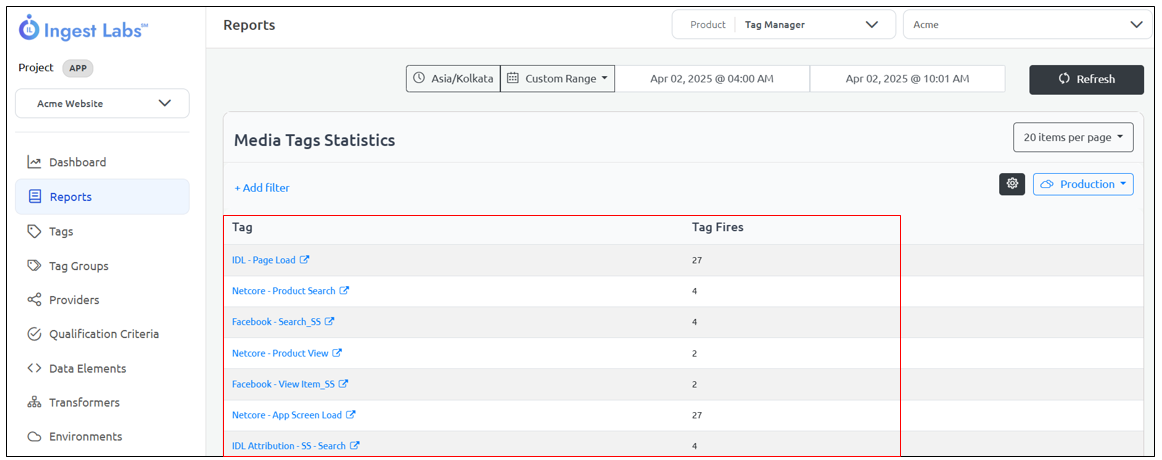 * **Tag Fires Column**: Shows the number of times the tag is triggered.