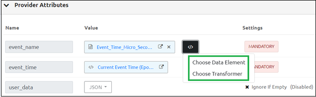 The Provider is a mandatory setting while adding a new tag. You can add any number of Provider attributes using the Key-Value pair and configure the settings using the Settings option. For a particular Provider attribute, you must set the value either from the Data Elements or Transformers. The user can view the provider attributes added from Provider side configuration.