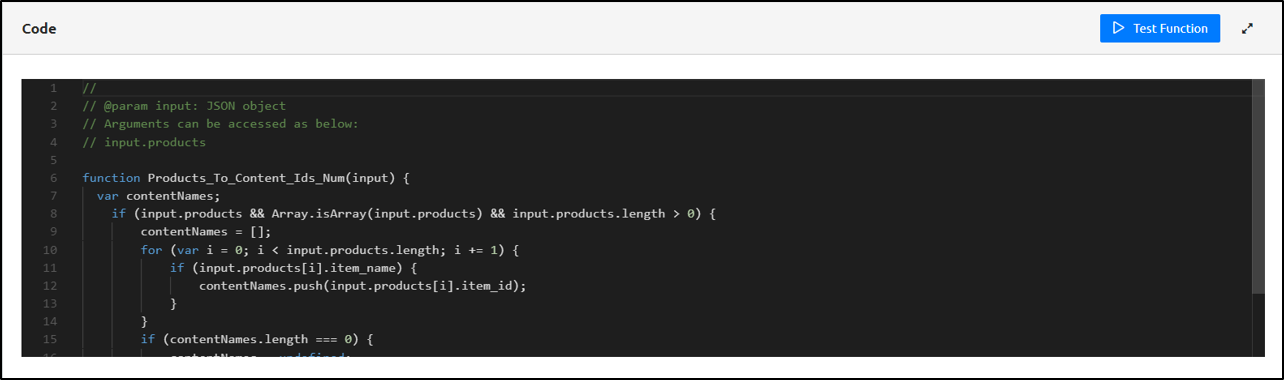 Step 6: To access the Argument, enter the code in the Code section. You can also Test the function using the Test Function tab on the right-hand corner of the screen.