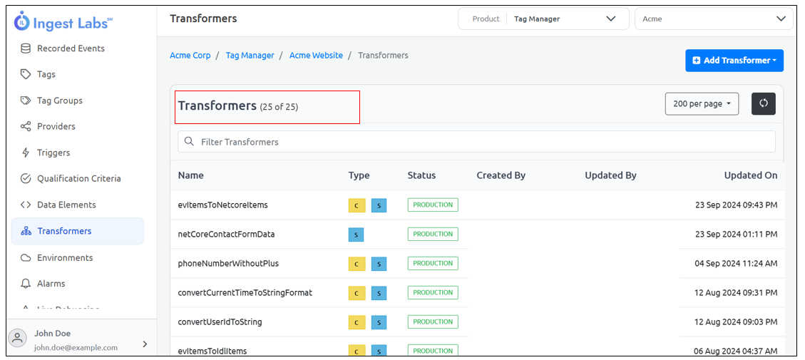 | **Status**     | <p>Denotes the status of the Transformer.<br>• Production: The Transformer is under production.<br>• Staging: The Transformer is in Staging.<br>• Pending Publish: The Transformer is yet to be published.</p> |