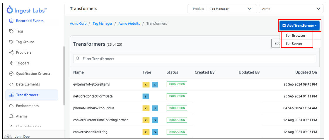 Click the **Transformers** dropdown. You will see two options: **For Server** and **For Browser**. Select the required option.